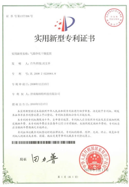 - 氣源凈化干燥裝置專利證書