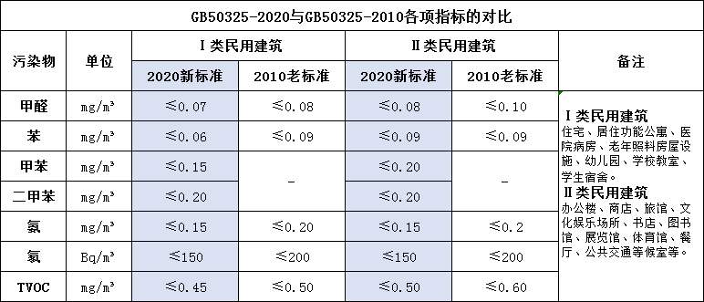 2)增加了室內空氣中污染物種類。GB 50325-2010(2013年版)中室內空氣污染物有5種(氡、甲醛、苯、氨、TVOC),本標準在GB 50325-2010(2013年版)的基礎上增加了甲苯和二甲苯,合計7種。