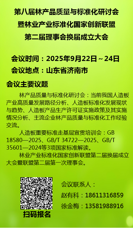 會議期間,將開展“國家標準走基層”宣貫活動:GB 18580—2025《室內裝飾裝修材料 人造板及其制品中甲醛釋放限量》、GB/T 34722—2025《浸漬膠膜紙飾面細木工板和膠合板》和GB/T 35601—2024《綠色產品評價 人造板和木質地板》等重要國家標準。